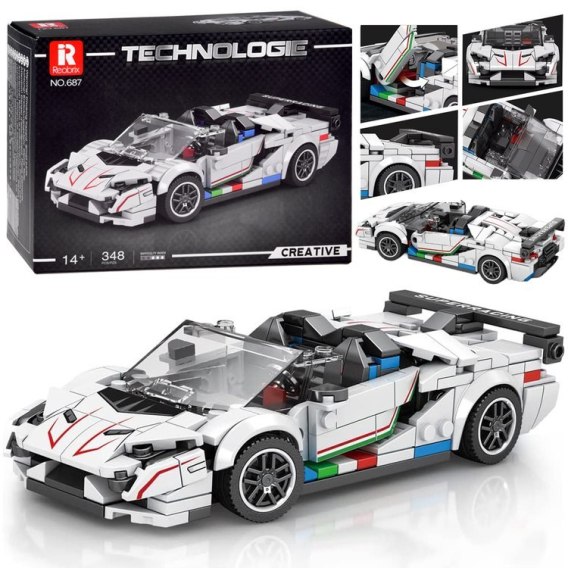 687 klocki plastikowe, techniczne, samochód sportowy, pojazd, auto wyścigowe, sportowe auto, naklejki do dekoracji pojazdu w zestawie, technologie, cabrio